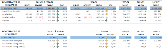 O 2° trimestre teve um bom resultado, puxado pelo investimento no exterior e pasmem pela bolsa brasileira. O ROE acumulado de 12 meses foi de 11,6% e o 2024-3T foi de 4,1%. O resultado final desse trimestre comparado com CDI e IPCA foram bons: 156,2 % do CDI e 4,1% acima do índice de inflação IPCA trimestral. No acumulado de 12 meses foram ganho rela (descontado a inflação) de 6,85% e 105,2% do CDI.